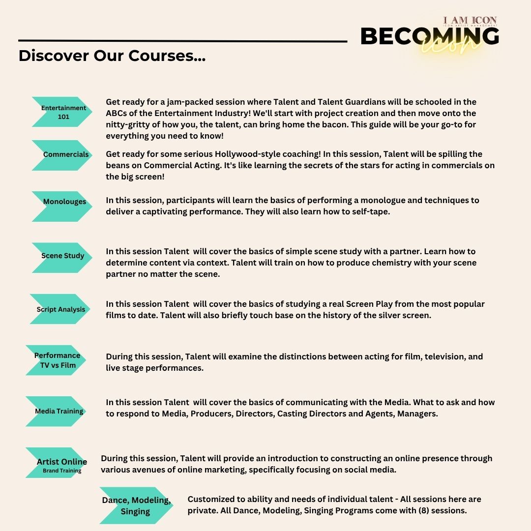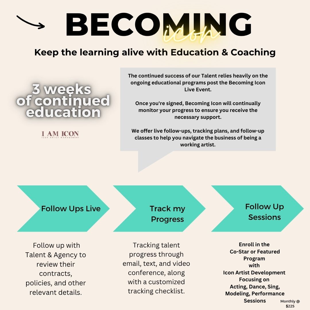 BECOMING ICON Live: Training Tomorrow’s Icons Today is an exclusive event designed for aspiring actors, models, dancers, musicians, and performers worldwide. This event stands out from traditional talent scouting conventions by offering real-world entertainment industry training and management, along with invaluable artist development mentorship. Participants will gain hands-on experience through acting classes online, receiving guidance from an award-winning Artist Development team in collaboration with top industry professionals, including agents, managers, producers, directors, and publicists. With dedicated mentorship and essential industry connections, attendees are equipped with the tools and support needed for successful audition bookings and to navigate their artistic careers, all while following a comprehensive Entertainment Career Guide.