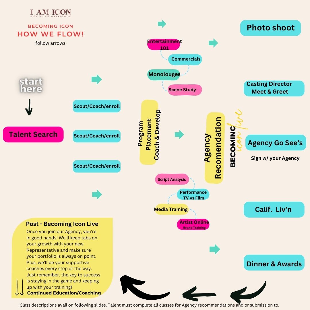 We love our talent and are always on the lookout for the next star of Becoming Icon Live! 🌟 If you want to shine, consider our acting classes online and artist development mentorship. Auditions, audition bookings, and inquiries are by appointment—email or text us to get started on your Entertainment Career Guide and receive top-notch Entertainment Industry Training! 💕